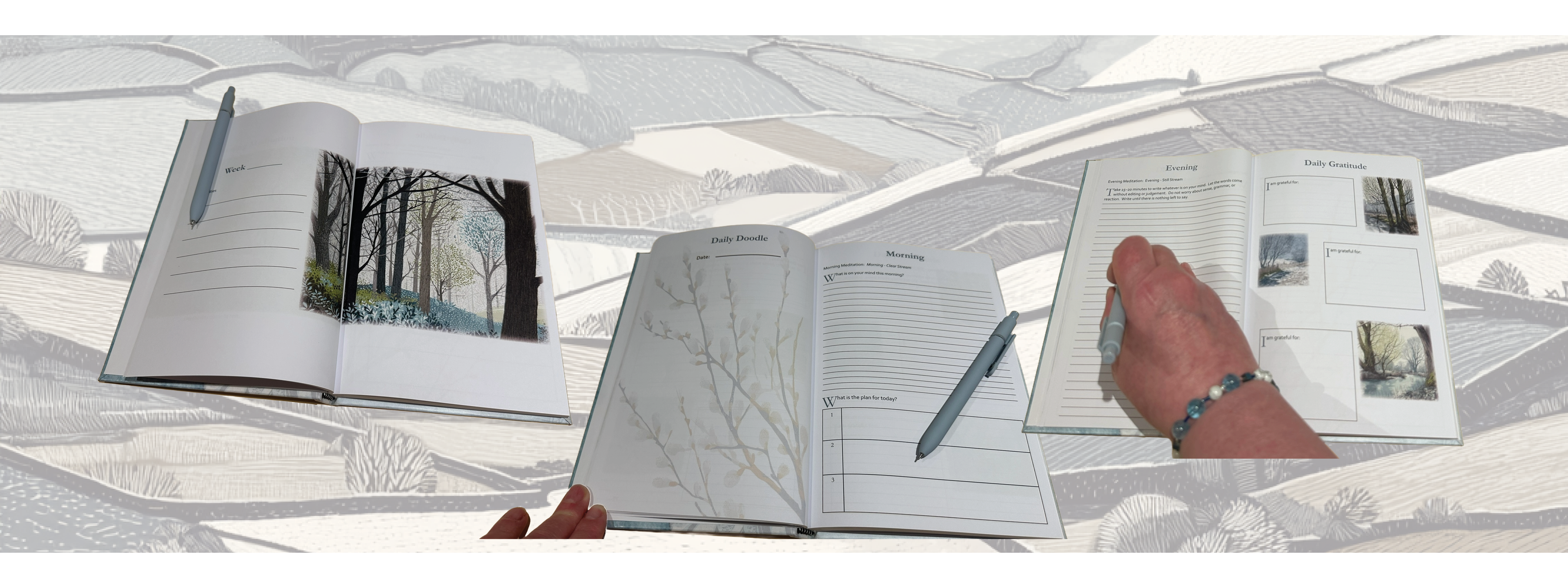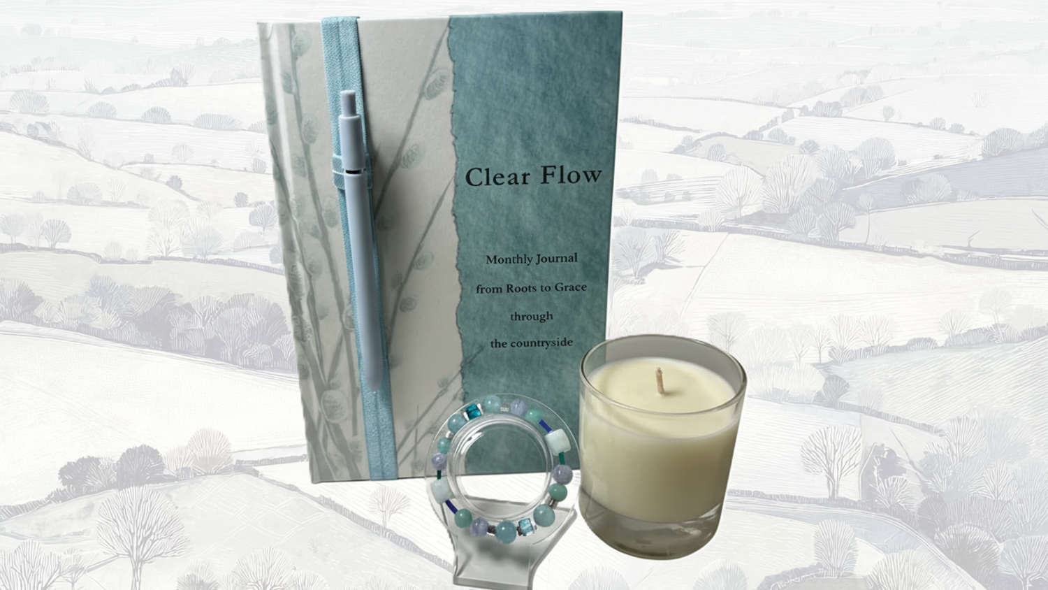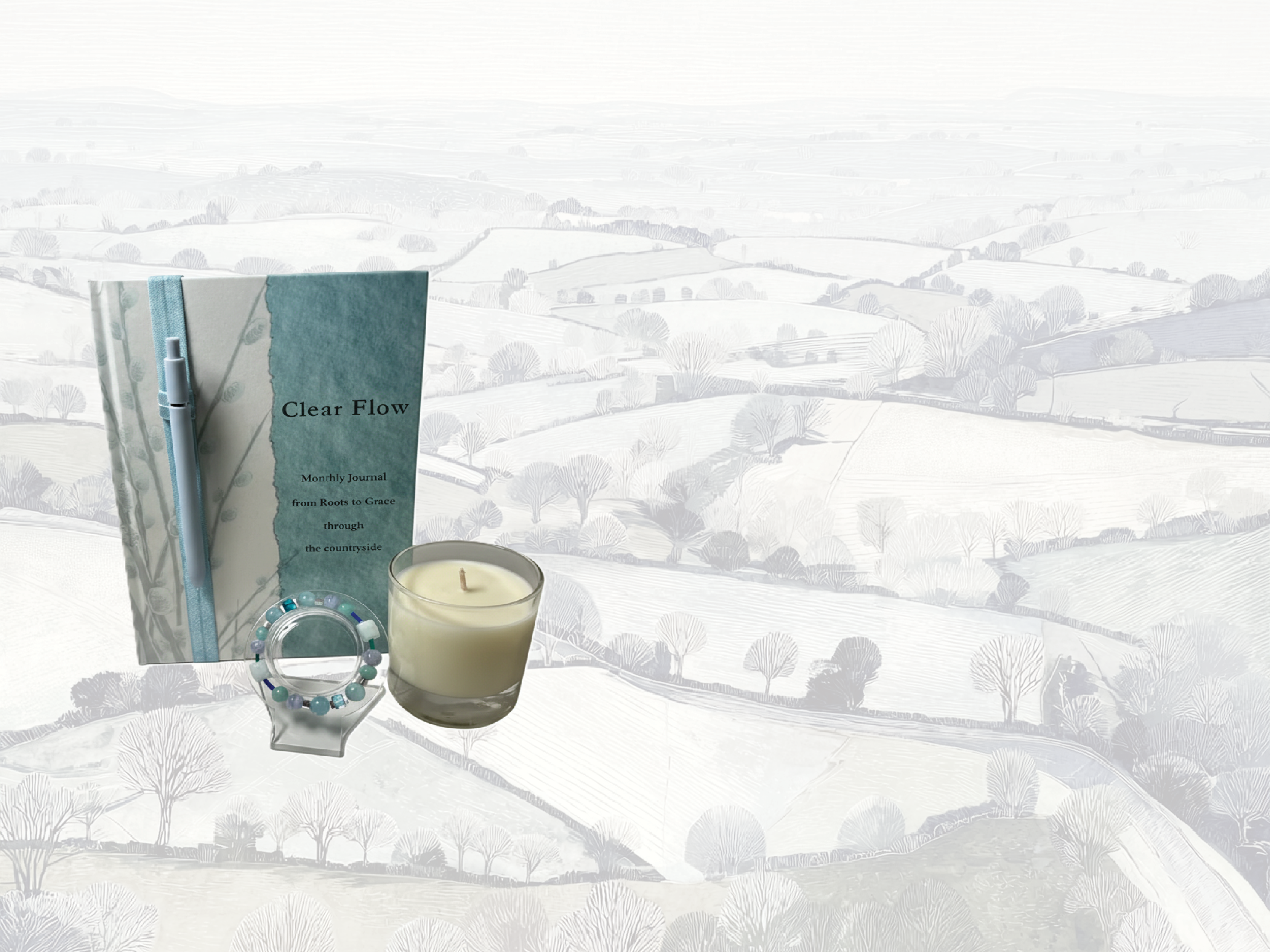 Each monthly subscription includes a thoughtfully designed journal, guiding you through the landscape in linocut-inspired artwork, alongside a gemstone bracelet and a softly scented candle. Together, they create a calm, sensory ritual to help you feel grounded, present, and in flow.